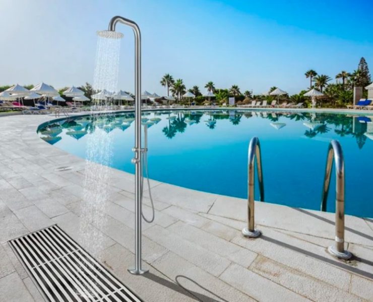 Heatgene (Sterling, VA) makes free-standing outdoor showers. The unit pictured here is designed for both commercial and residential use, with a stainless steel shower head, round hand shower with hose in the middle, with a one-way or diverter for head shower or hand shower. Food-grade silicone nozzles helps reduce hard water deposit build-up on the showerhead, making it easier to clean and maintain. It delivers high-power water delivery, even when water pressure is low for a smoother, gentler, more luxurious showering experience To learn more, click here.